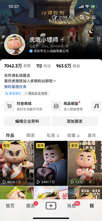 @虎墩小镖师 是元人动画的 IP 孵化成功的经典案例,虎墩不仅是抖音短视频的千万级网红,更是2022年春晚的现象级爆款IP。目前,抖音账号粉丝963w,快手粉丝376w,累计全网短视频平台粉丝近1500W,所有体量的原创视频播放量近150亿,点赞量超近亿,多条视频单次播放量超1亿。其次,虎墩小镖师获得中国国际新媒体节动画短片一等奖、蝉妈妈大会年度自最具潜力内容创作者、2022年抖音创作者大会获得”抖音年度优质创作之光。2022与字节跳动合作推出的番剧《虎墩之实习镖师与菜鸟劫匪》即将上线,将IP下沉青少年年龄段受众,深化内容价值。